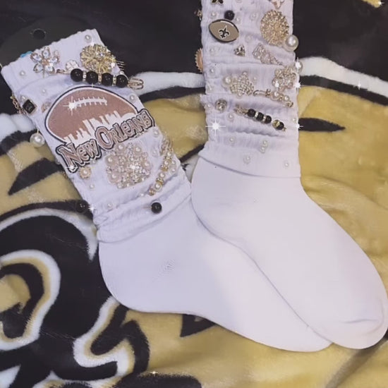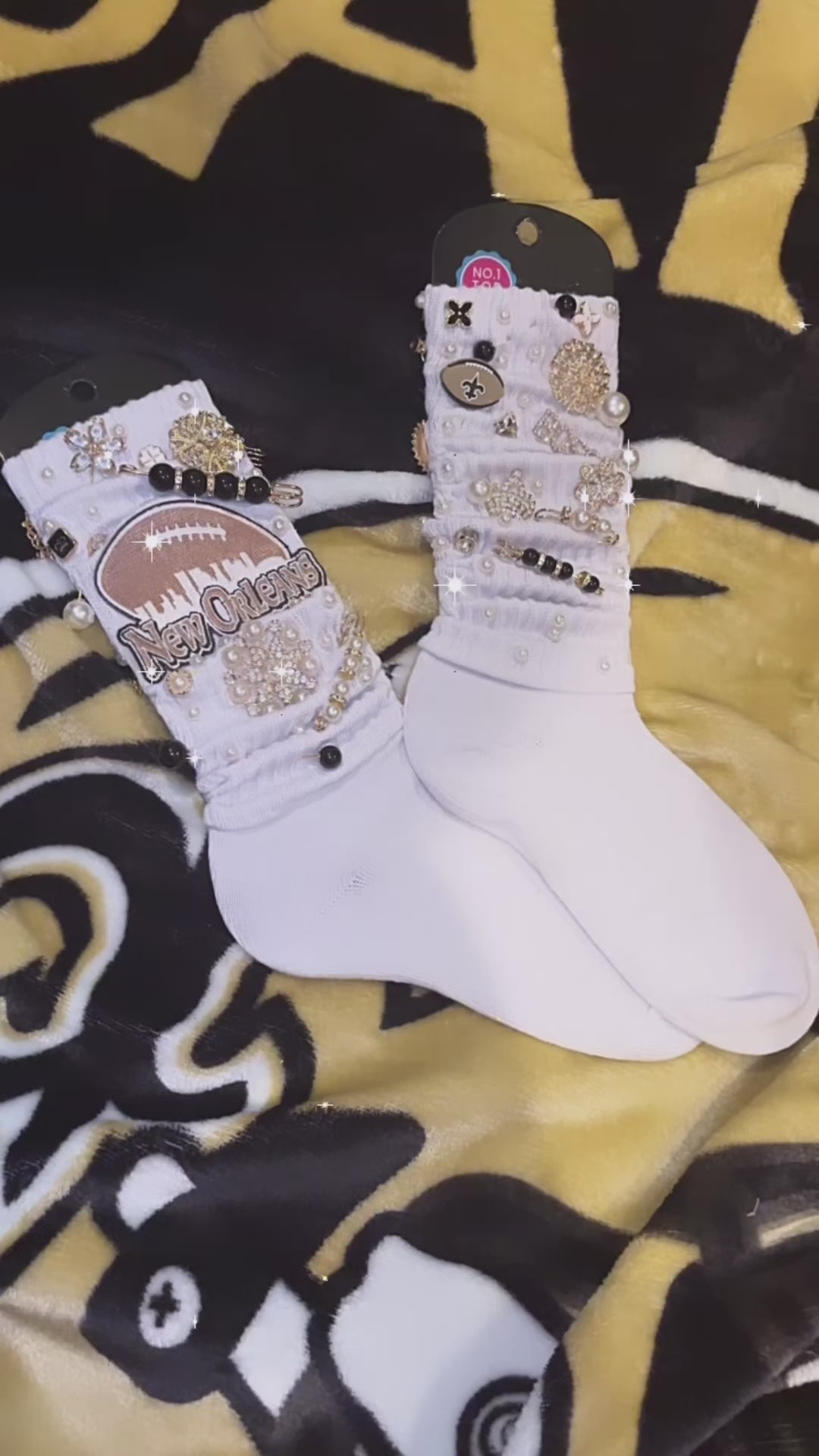 These New Orleans Black and Gold Charm Socks offer a stylish and comfortable way to show off your love for the city and its beloved sports teams. Made from high-quality materials, they provide a snug fit and eye-catching design. Perfect for any fan or fashion-conscious individual.