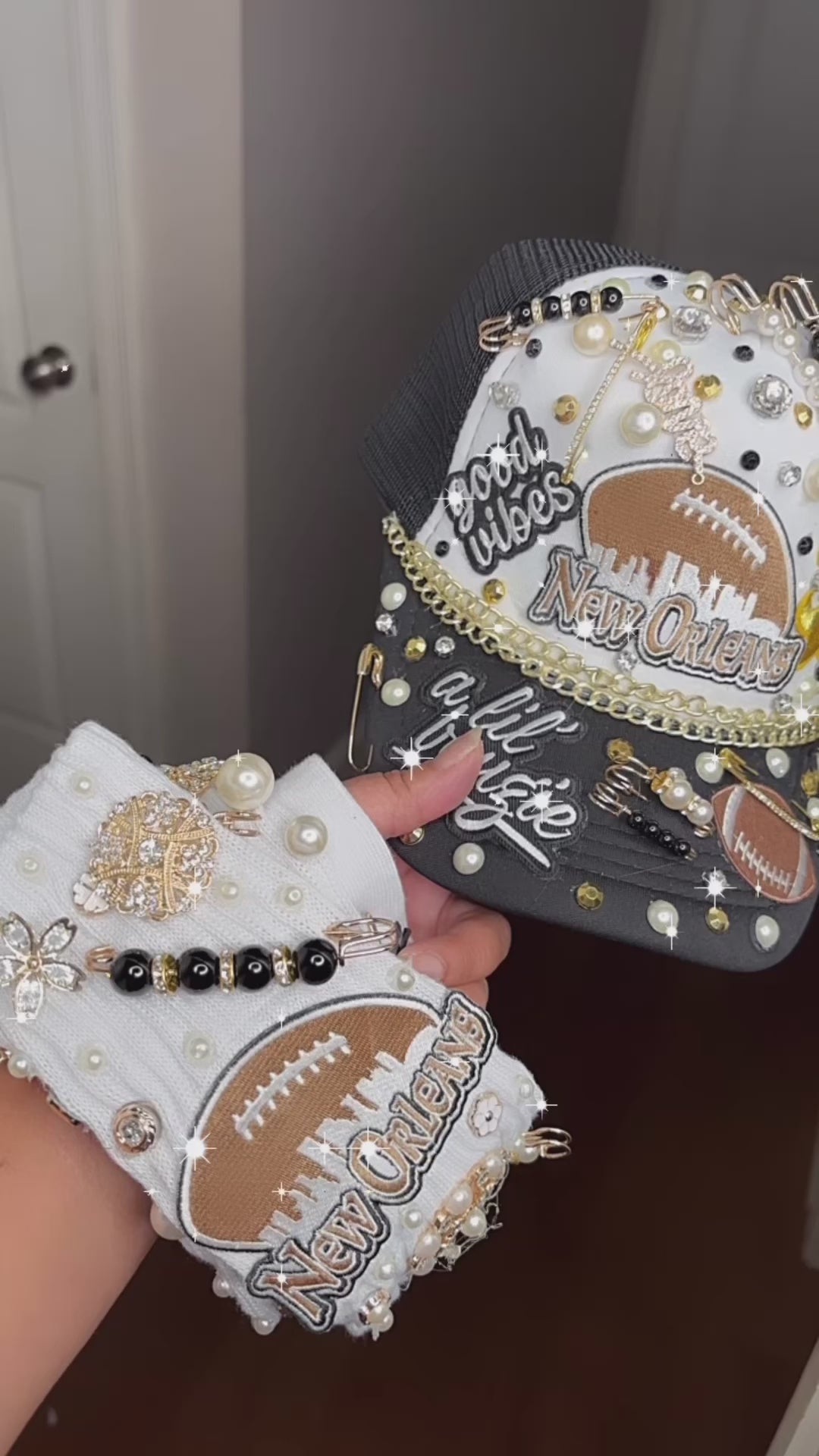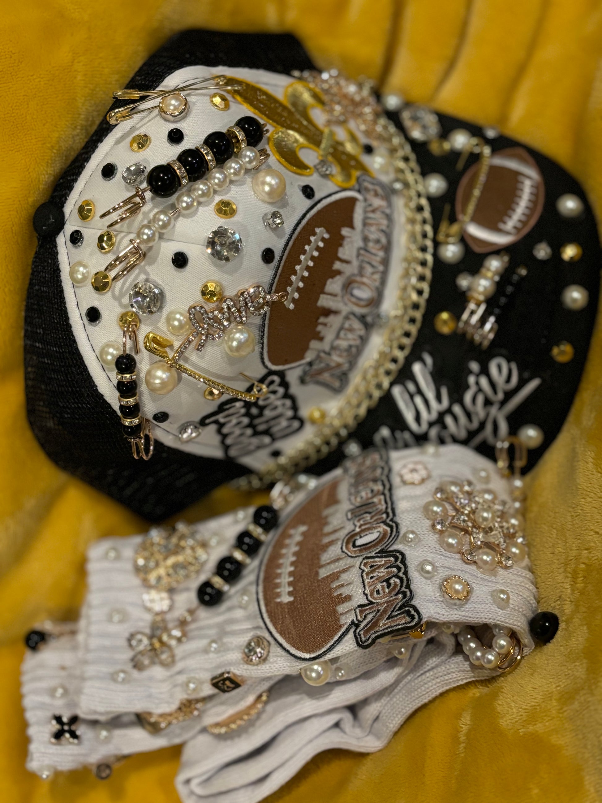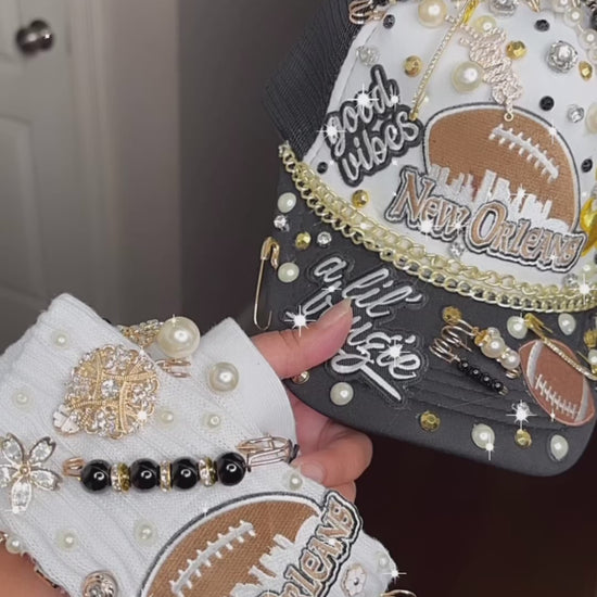 Introducing the New Orleans Black n Gold SnapBack B’Dazzle Cap with Matching Socks Set - the perfect match for any fan! Made with stylish black and gold design, this set lets you show your love for the team from head to toe. Dominate in style and comfort with this must-have set.
